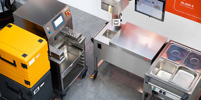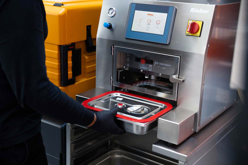 Die digitale Prozessführung beginnt bereits in der Küche bei der Befüllung mit der neuen GN Fill Station, die Portionsmengen und Lieferinformationen auf Basis digitaler Vorgaben aus dem Warenwirtschaftssystem anzeigt. Dieses kann über universale Schnittstellen flexibel an das CHECK TRACE System von Rieber angebunden werden. Darüber hinaus können weitere Daten vom Warenwirtschaftssystem mit dem Rieber QR-Code der Behälter und Deckel verknüpft werden. Anschließend übernimmt die GN Cover Station das sichere Verdeckeln mit wasserdichten Steckdeckeln oder vaculid Light Vakuumierdeckeln.