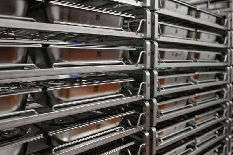 Zudem reduziert das konische Behälterdesign den Platzbedarf um bis zu 75 Prozent, dadurch können rund viermal so viele GNauto-Behälter gelagert werden wie bei klassischen GN-Behältern. Für eine effiziente Inhouse-Logistik sorgt der GNauto-Stapelwagen, als praktisches und mobiles Lager. Außerhaus sichern digital vernetzte Thermoporte zusätzlich die HACCP-konforme Temperaturdokumentation während Transport und Ausgabe.